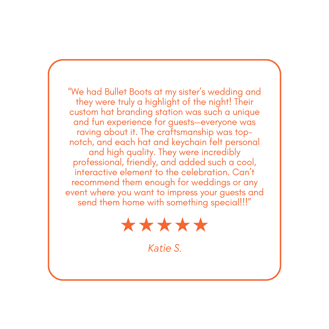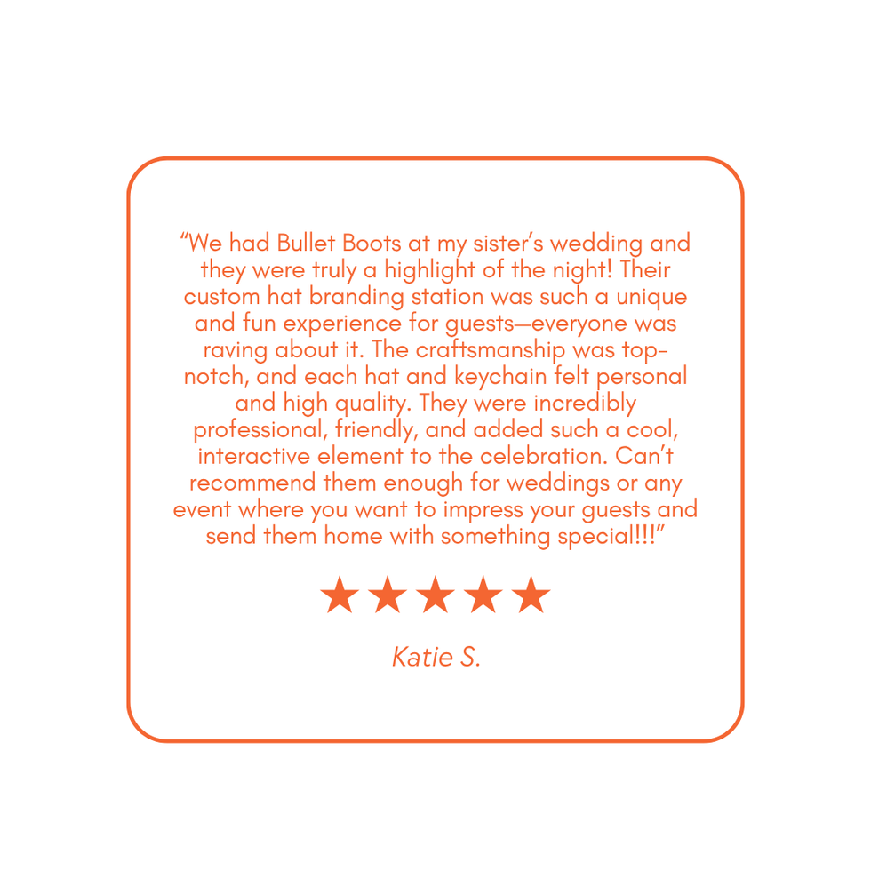 Bullet Boots delivers a luxury, one-of-a-kind experience designed to make a lasting impression. Proudly known as the Tri-State’s first Hat Bar and the leading leather branders in the region. Our interactive process blends style and craftsmanship, perfect for everything from intimate gatherings to large-scale activations.