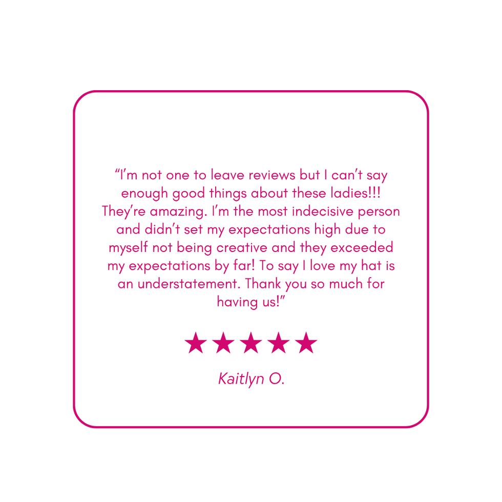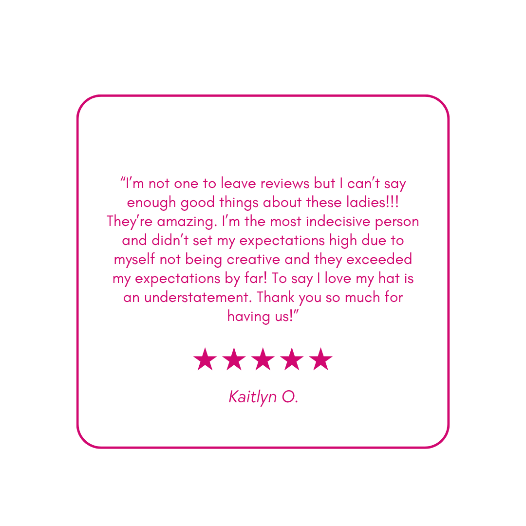 Whether you’re drawn to a cowboy, flat brim, or trucker hat, the possibilities are endless. With a wide selection of charms, letters, pins, patches, fabrics, ribbons, feathers, and more, you have the freedom to make your hat as personal as your story. Once you’ve made it yours, one of our professionally trained stylists will handcraft your custom creation, ensuring every detail is perfect.